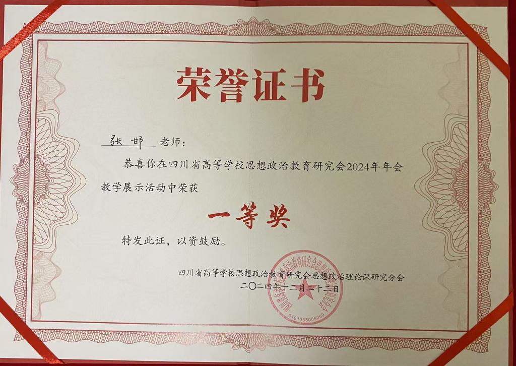 张邯博士教学展示一等奖证书