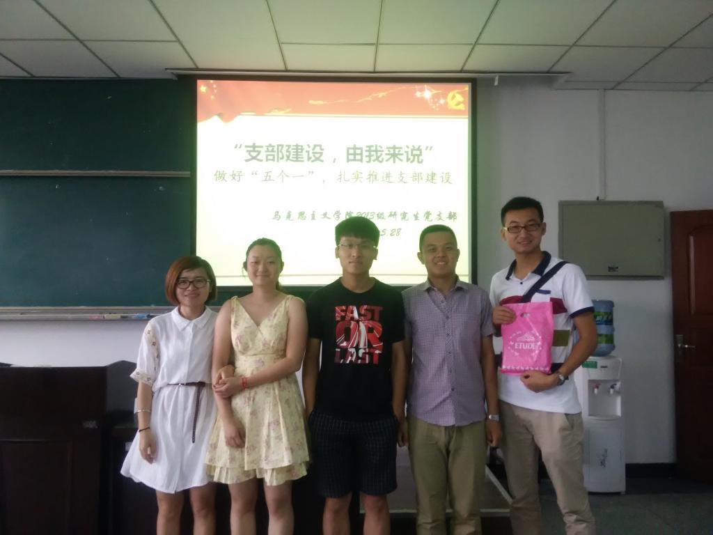“支部建设,由我来说”。5月28日下午,马克思主义学院2013级研究生党支部在博学楼A508会议室召开题为“五个一”的组织活动。“五个一”即推荐一部电影、推荐一部好书、结成一个对子、解读一个热点、提出一个建议。活动以小组形式展开,支部全体成员、部分非党员同学以及班主任卢婷婷老师参加了本次活动。