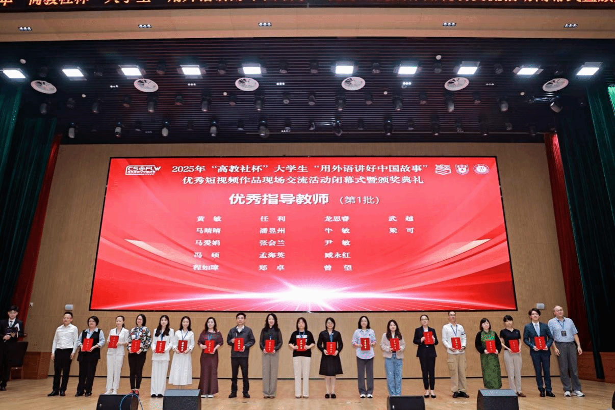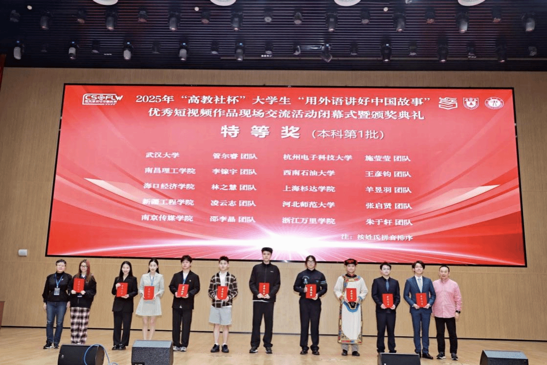 近日,由中国英汉语比较研究会指导,南京大学、江汉大学主办,高等教育出版社协办的2025年“高教社杯”大学生“用外语讲好中国故事”优秀短视频大赛全国总决赛在江汉大学顺利落幕。本次大赛,经过对来自哈尔滨工业大学、湖南大学、南京大学、中国人民大学等29个省、自治区、直辖市的1093所院校的6915件作品的校级、省级遴选,共有124件作品入围全国总决赛。最终,我院周惜缘团队凭借对中国故事的深度解读、精湛的外语表达能力及高质量的视频创作水平,在众多优秀参赛作品中脱颖而出,成功斩获国家级特等奖,潘昱州老师、王霞老师获评“优秀指导教师”。