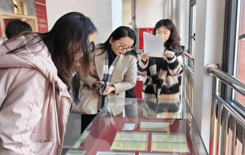 此次活动首站来到大丰街道党员档案室。大丰街道工作人员以档案消杀设备为切入点,向师生全面且完整地演示了基层档案管理的全流程工作:自纸质档案接收之后,严格开展分类编码、进行细致的除尘以及专业的细菌消杀工作,随后通过微机系统精准录入相关信息,最终借助智能储存柜实现扫码存取操作。这让现场师生切实体会到基层党建工作“严谨务实”的优良作风。随后,师生沿档案主题历史文化长廊开展参观学习。在“中共一号机密”展区,泛黄的文献复印件、模拟的档案藏匿场景,搭配工作人员的讲解,将中央文库工作人员“用生命护文献”的历程娓娓道来。田家英“与农民同吃同住调研写报告”的笔记本复制品、郑小瑛“带着乐队赴解放区演出”的老照片,更进一步具象化“求实爱民、英勇报国”的精神内涵。一份份红色档案从史料中“走”出来、在我们的眼前“活”起来。