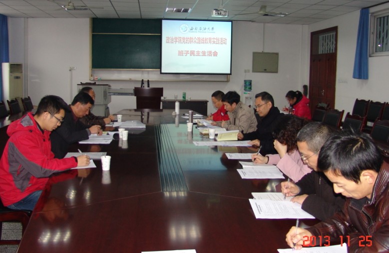 11月25日上午,政治学院在博学楼A508会议室召开了学院党的群众路线教育实践活动党政领导班子专题民主生活会,校党委书记孙一平,学校教育实践活动督导组成员杨华斌、覃吉春,政治学院党政班子全体成员出席会议。学院院长助理、支部书记、教研室主任及组织员列席会议。会议由学院党总支副书记帅建祥同志主持。