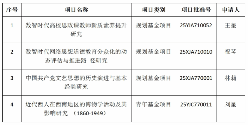 近日,教育部社科司发布了2025年度教育部人文社会科学研究一般项目立项通知,我院共4个项目获批立项,立项数量实现新的突破。