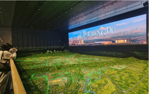 “雪山下的公园城市,烟火里的幸福成都,奋进中的创新之城”。成都市规划馆以“自然地理-历史文化-蜀地人杰-规划建设大事记-档案城市记忆”为主线,系统展示了城市发展战略定位、规划建设成果及未来愿景。师生们通过数字沙盘、三维建模等现代技术手段,直观感受了成都“多中心、组团式、网络化”的超大城市空间格局。在CAVE沉浸式影院中,地质演化过程与历史发展脉络通过3D影像生动呈现,使抽象的城市规划理论具象化为可感知的空间形态。