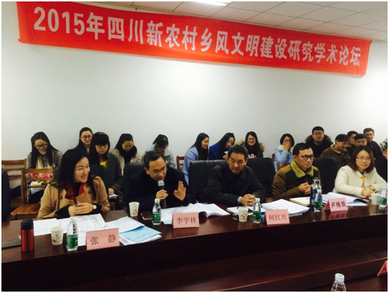 我院李学林教授在会上做了精彩的发言。他指出,现代乡风文明建设主要出现了农业现代化、农村信息化和市场化三大问题导致了农村生活方式的改变、人情关系的淡化,因此新农村乡风文明建设的问题应该直指“乡愁”问题。李教授用习近平总书记在中央城镇化工作会议上讲过的“城镇建设……让居民望得见山、看得见水、记得住乡愁”引出自己的观点。他说道:“乡愁的对象是对故乡的一种思念。”他特别强调了人文和自然美的统一,强调农村中的真善美。乡愁建设也应该考虑传统文化因素、现代化因素和自然环境因素。又透过农家乐建设现象中的功过指出四川乡风建设中的问题,最后提出了要坚持党的领导、提高农村居民素质和提倡农村精神文化的重建三个可行性解决方案。保持农村的话语权,以农村主体地位思考问题,才能保留文化中真正的乡风民俗。