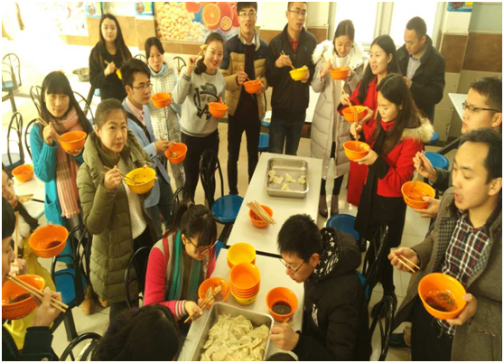 餐厅瞬间到处充满了欢声笑语,连食堂的阿姨都忍不住现场教学。当一盘盘热腾腾的饺子端上来时,大家拿着碗与勺,争先恐后品尝自己亲手包的饺子。嘴里品尝着自己的劳动果实,心里涌现着种种激动。