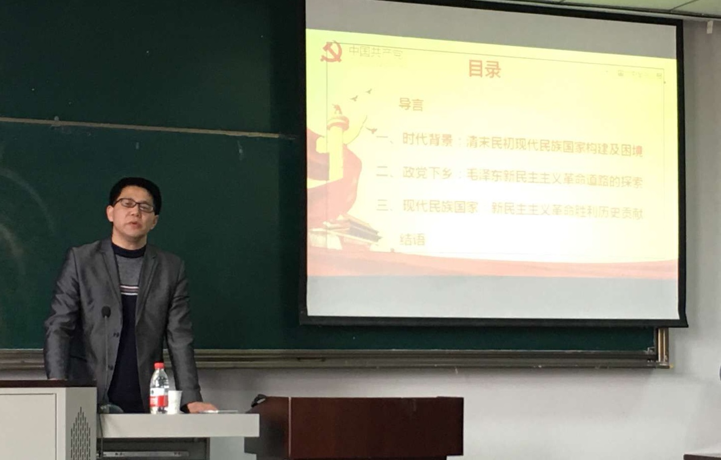 3月31日下午4点,应科研处和学院邀请,河北大学历史学博士、华东师范大学中共党史专业访问学者、四川大学历史学博士后、中共成都市委党校著名学者葛宝森老师做客我院弘毅沙龙,在博学楼A508做了以《构建现代民族国家——毛泽东领导新民主主义革命胜利的历史贡献》为题的精彩学术报告。马克思主义学院张小飞院长、崔发展副院长、我院部分老师以及全体研究生参加了此次学术报告。报告会由学院副院长崔发展主持。
