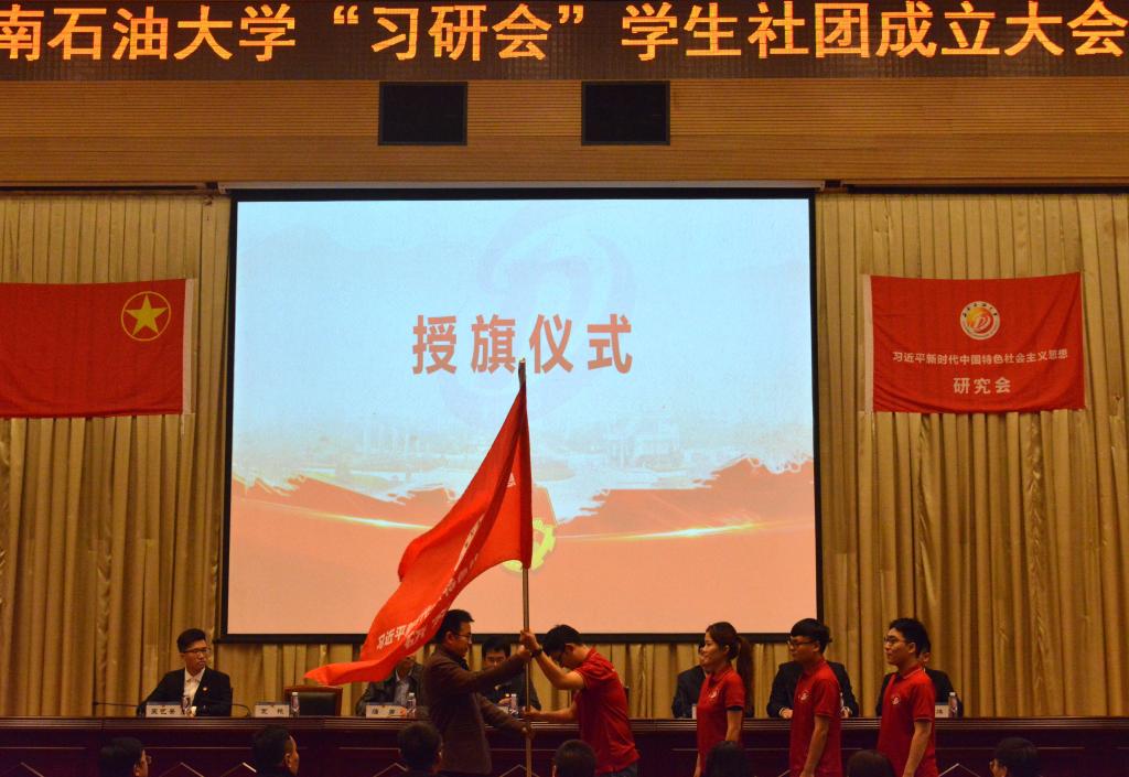 学工部(研工部)部长蒲勇宣读了《关于同意成立西南石油大学习近平新时代中国特色社会主义思想研究会学生社团的批复》,党委宣传部、统战部部长王义全为习研会授旗。