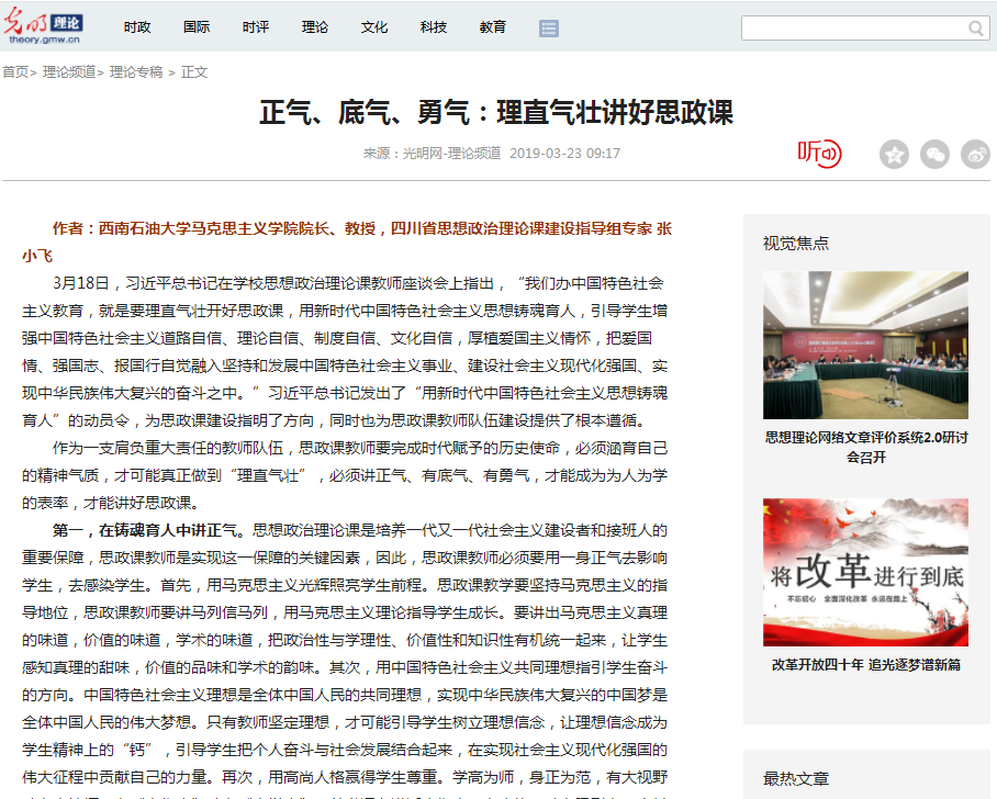 日前,光明网理论频道刊发了我校马克思主义学院院长、四川省思想政治理论课建设指导组专家、张小飞教授的署名文章。文章以《正气、底气、勇气:理直气壮讲好思政课》为题,结合习近平总书记在学校思想政治理论课教师座谈会上的讲话,对新时代思政课教师如何讲好思政课进行了深入探析。