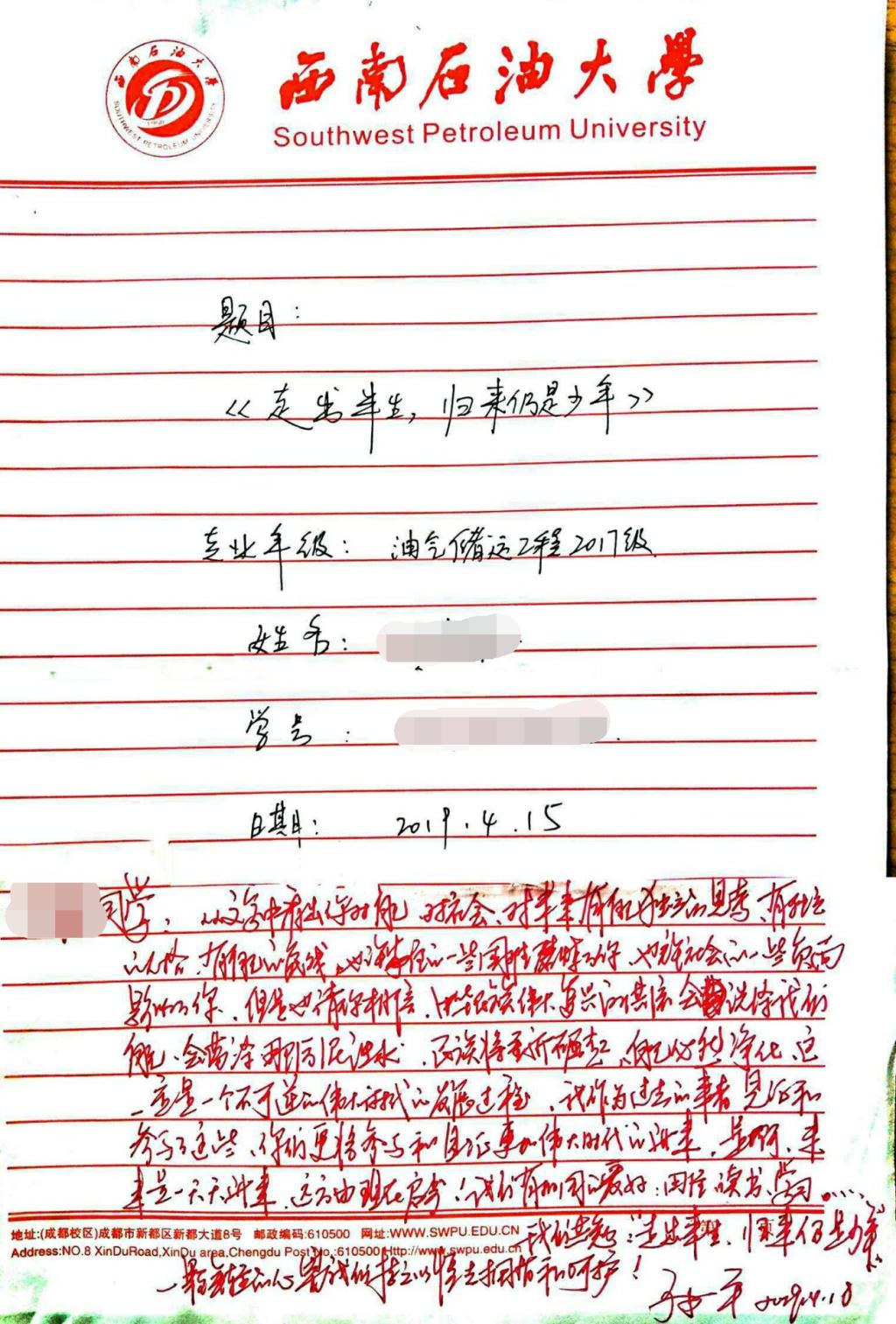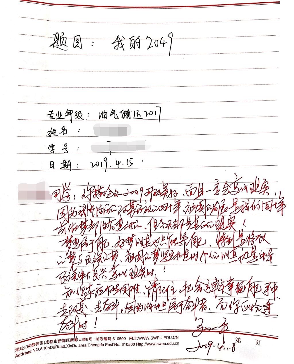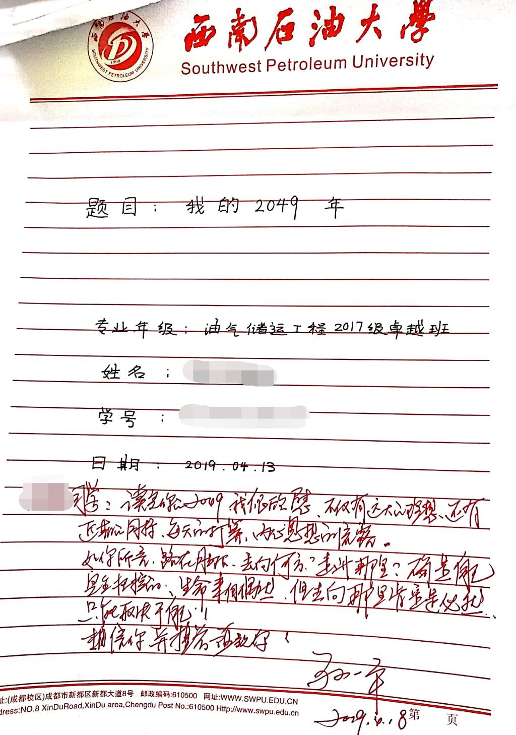 这40名学生均来自于石油与天然气工程学院油气储运工程2017级卓越班,该班是孙一平定点联系的班级。作为联系人,孙一平给同学们布置了一项特殊的作业:聊一聊你的2049会是什么样子,作业必须手写。