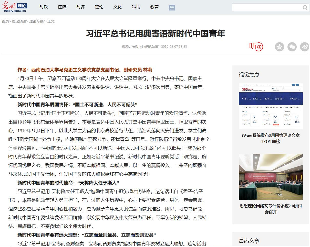 日前,光明网理论频道刊发了我校马克思主义学院党总支副书记、副研究员林莉的署名文章。文章以《习近平总书记用典寄语新时代中国青年》为题,结合习近平总书记在纪念五四运动100周年大会上的讲话,对习近平总书记引用典故寄语新时代中国青年进行深入总结阐述。