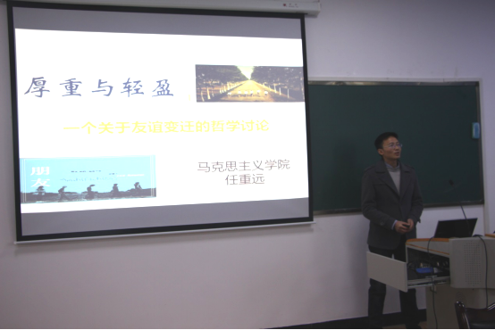 11月28日下午,西柚若水文化沙龙讲堂在思学楼D507会议室顺利举行。马克思主义学院副教授任重远应邀为我校研究生作了题为“厚重与轻盈——一个关于友谊变迁的哲学讨论”的主题讲座。此次讲座由马克思主义学院文化素质课教研室主任郭玉秀主持。