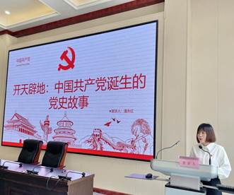 宣讲团成员潘永浩带来的宣讲主题是“开天辟地:中国共产党诞生的党史故事”,她由一个间谍潜入中共一大会场的小故事开头,带领大家回顾了惊心动魄的开会过程,让同学们深刻体会到中国共产党一路走来的艰辛。