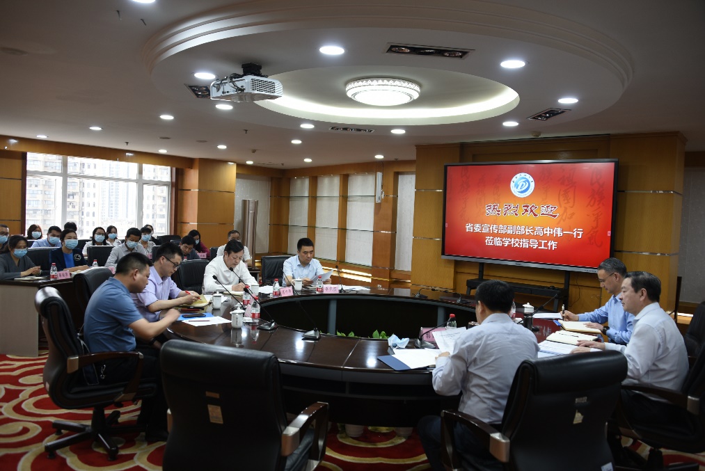 3月17日下午,四川省委宣传部副部长、省社科院党委书记高中伟一行来校调研省重点马克思主义学院建设情况。省委宣传部理论处(哲社办)处长李先波、四级调研员彭膺昊,省教育厅宣思统战处处长李大鹏,校党委书记陈永灿,党委常委、副校长郭建春,学院领导班子成员、教师代表参加调研座谈会。调研座谈会由郭建春主持。