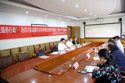 在成都市青白江区大弯中学,肖虎副处长和张小飞院长就思政课大中学校对接与互补、学生生涯规划、学生心理健康等问题与大弯中学校长赵泽高进行讨论。最后,张小飞院长表达了对两校建立长期合作机制,加强交流沟通的期盼,表示可以从师资共享、资源共建、课程共当、成果共享等方面与大弯中学加强合作。