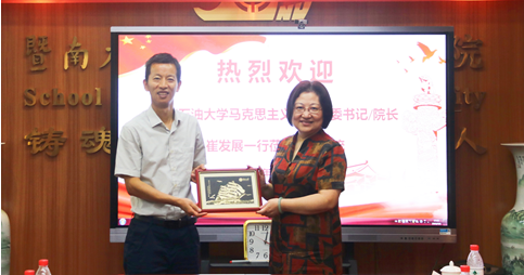 座谈会期间,双方还就学院建设、高级别课题的申报、教学比赛的备赛以及行业类高校的思想政治教育教学等问题开展了深入的交流,互相分享了各自的经验做法。最后,会谈双方表示今后要进一步加强沟通,并在教学、科研等方面加强交流与合作。暨南大学马克思主义学院院长程京武教授向我院赠送了纪念品。该纪念品镌刻了习近平总书记到暨南大学考察时勉励同学们时所说的“把中华优秀传统文化传播到五湖四海”,体现了暨南大学鲜明的办学特色,更是寄托了总书记的殷殷嘱托。