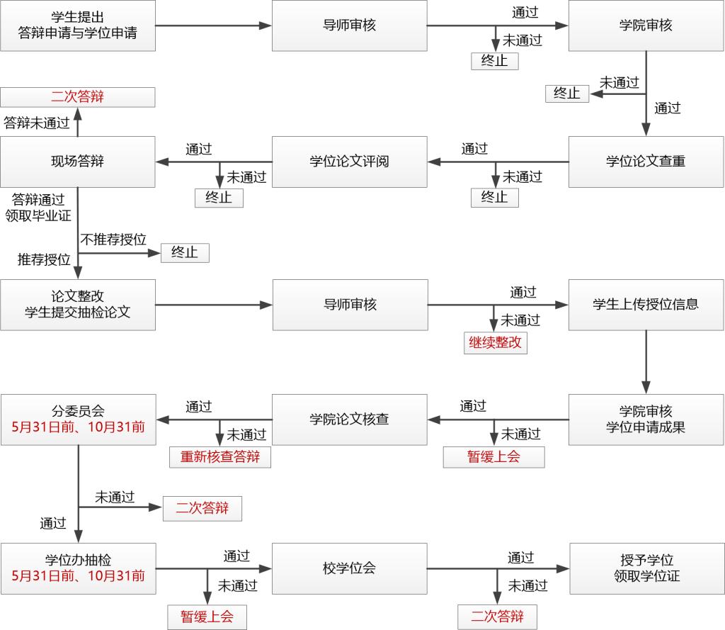 2023年春季学期研究生学位论文答辩和学位授予只能通过研究生应用管理平台办理,研究生学位授予流程图如下。