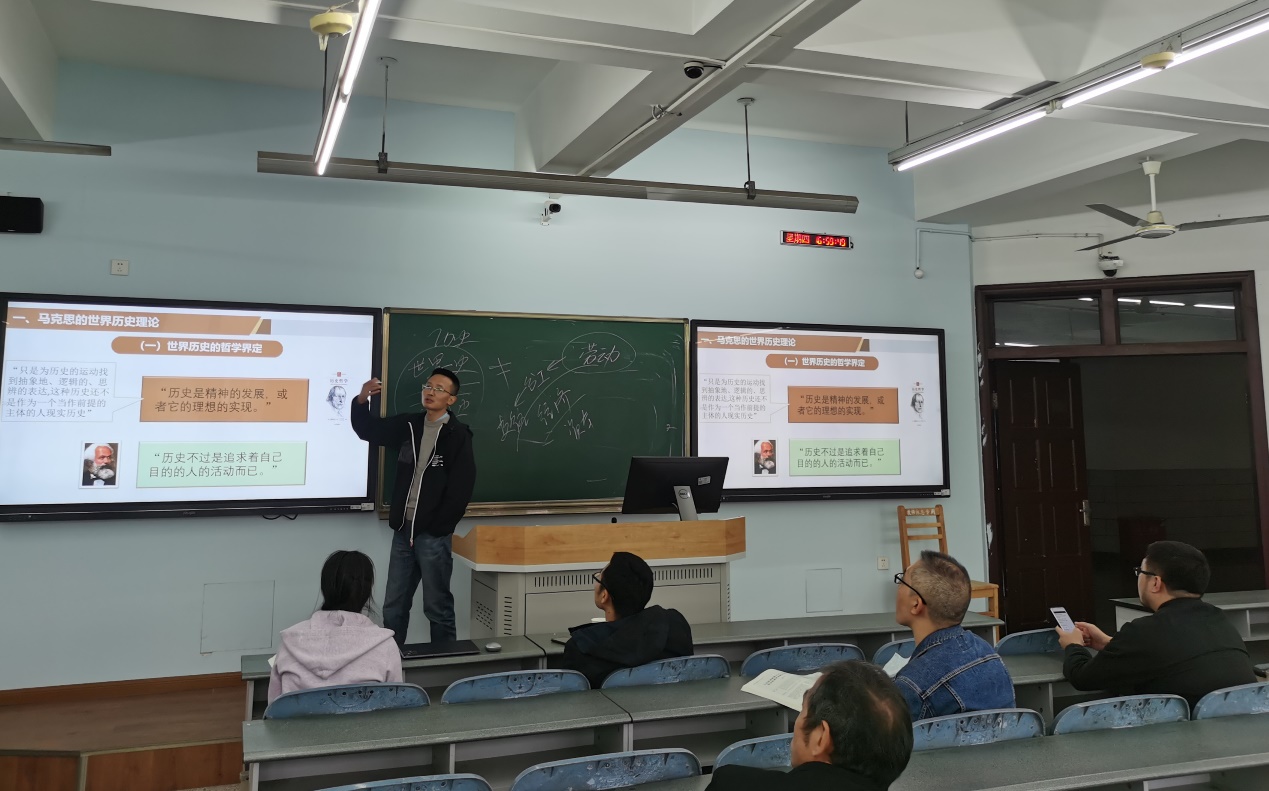 随后,教研室教师在思学楼C410教室,集中听取任重远副教授所做的《马克思主义基本原理》专题试讲。任重远副教授针对“人类的普遍交往与世界历史的形成发展”这一主题进行系统讲解,指出世界历史和资本主义发展是紧密联系的,世界历史的形成归根结底是与资本相关,体现为“大工业——世界市场——普遍交往——世界历史”的逻辑顺序。而共产主义则必然是这一逻辑的指向。现场各位教师充分肯定了任重远副教授的教学逻辑架构,并就世界历史的哲学范畴、世界历史的概念界定以及个别内容连结性等问题提出自己的看法,进行了良好的互动,为该专题内容提供了丰富的教学实践资源。