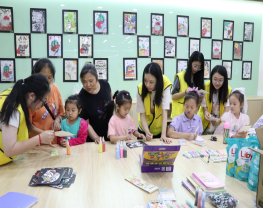 图八 志愿者与孩子一起绘画 图九 普河社区集体照