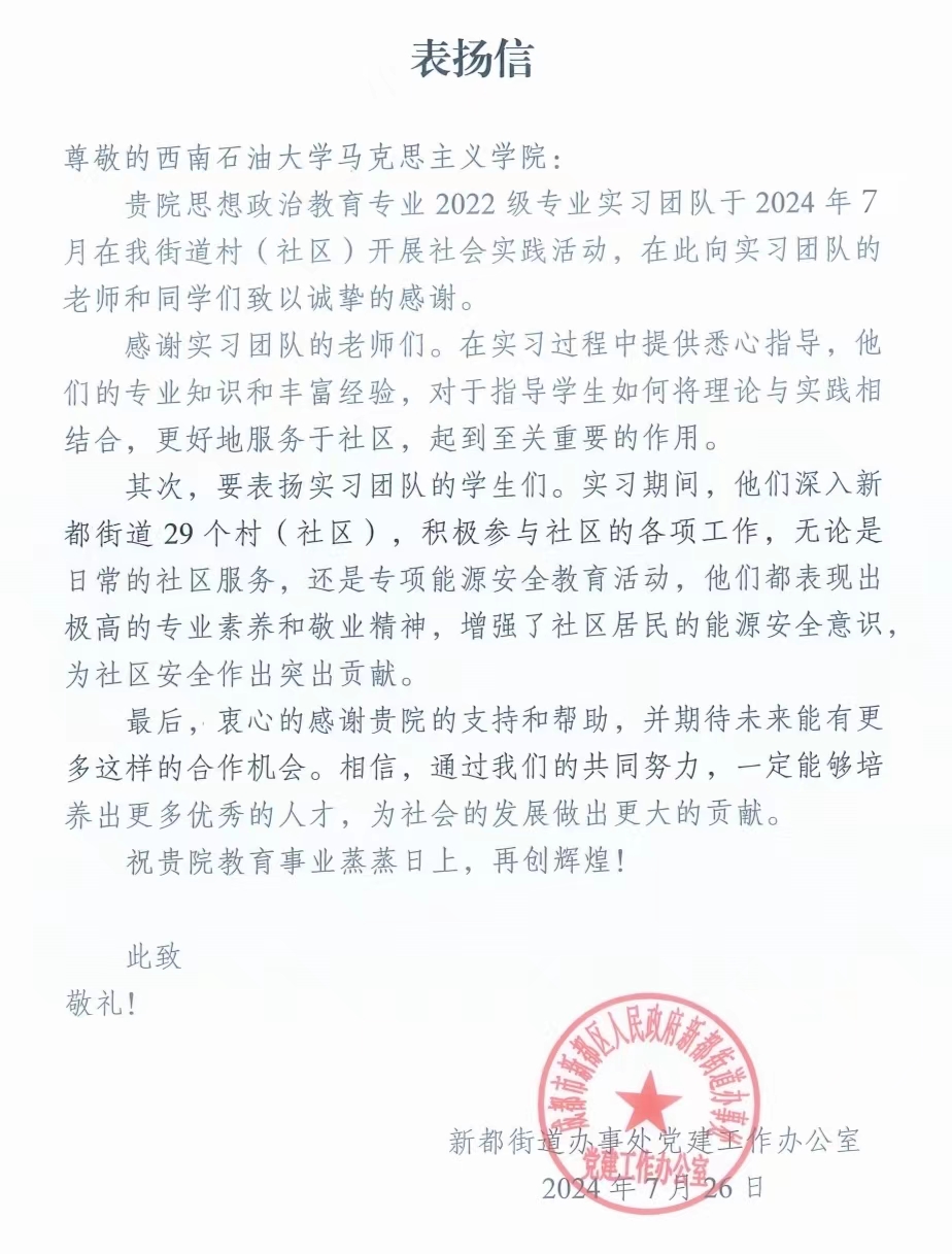 近日,我院思想政治教育本科2022级专业实习队收到一封来自新都街道办事处的表扬信。“实习期间,他们深入新都街道29个村(社区),积极参与社区的各项工作,无论是日常的社区服务,还是专项能源安全教育活动,他们都表现出极高的专业素养和敬业精神,增强了社区居民的能源安全意识,为社区安全作出突出贡献。”新都街道办事处党建工作办公室高度表扬了同学们。