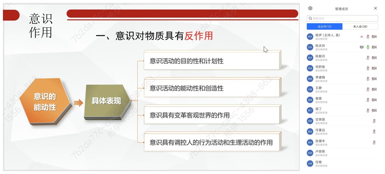 随后,青年教师陈庆玲选取“马克思主义基本原理”课程中的“意识对物质的反作用”知识点作讲解,第三届全国高校思想政治理论课教学展示活动特等奖获得者任重远副教授进行点评。双方结合课件制作、课堂互动、语言技巧等方面内容开展深入交流,充分发挥了虚拟教研室的平台功能,有效促进了青年教师的授课水平。