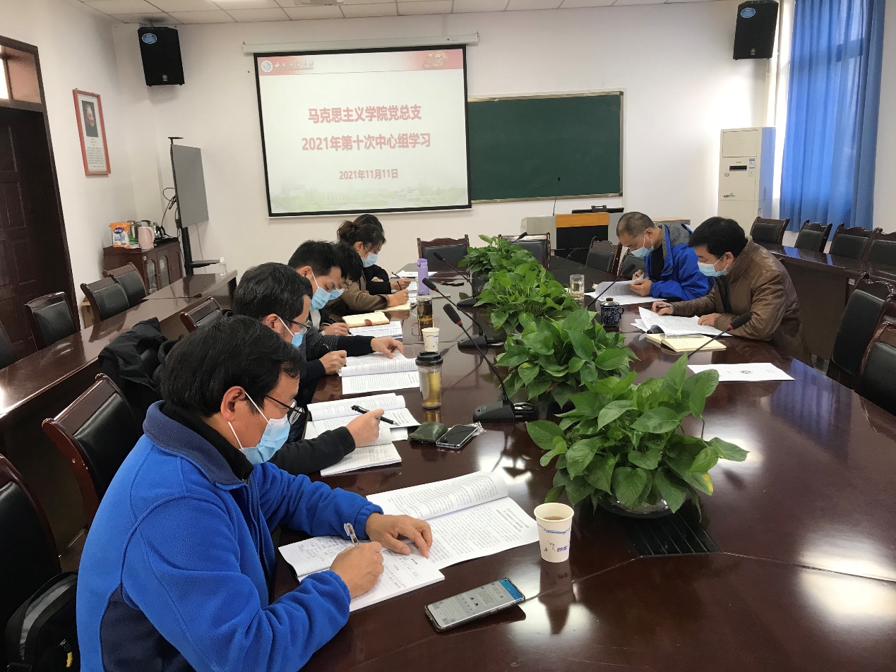 2021年11月11日,马克思主义学院党总支2021学年第十次中心组学习会议在思学楼D507召开,集中学习了中央人才工作会议精神、《中华人民共和国家庭教育促进法》、习近平总书记在纪念辛亥革命110周年大会上的讲话精神、习近平总书记在中华人民共和国恢复联合国合法席位50周年纪念会议上的讲话精神。本次学习由马克思主义学院院长张小飞主持召开,学院班子成员、党总支委员会委员、支部书记参加。