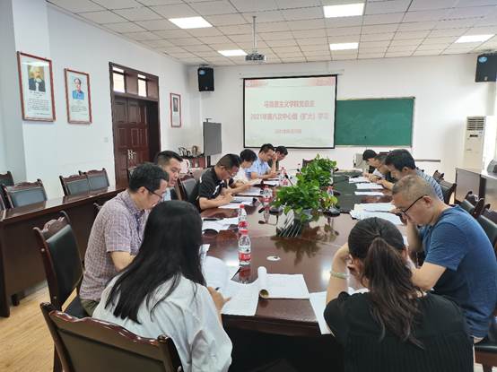 2021年6月30日,马克思主义学院党总支第八次中心组(扩大)学习会议在思学楼D507召开,集中学习了《中国新型政党制度》白皮书以及《中国共产党普通高等学校基层组织工作条例》《中国共产党组织工作条例》《中国共产党组织处理规定(试行)》等。本次学习由党总支书记崔发展主持召开,班子成员、党总支委员会委员、支部全体委员、科级干部、教研室主任与副主任、工会主席与副主席参加,学校党史学习教育第四组巡回督导组副组长陈俐宏、联络员秦海洋列席第八次中心组(扩大)学习会议。