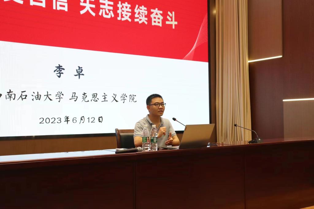 6月12日晚上,我院教工三支部书记李卓受邀为四川旅游学院外国语学院学生党员、预备党员以及入党积极分子讲授学习贯彻习近平新时代中国特色社会主义思想主题教育专题党课。此次讲座有近200人参加,由外国语学院学生科科长叶欣主持。