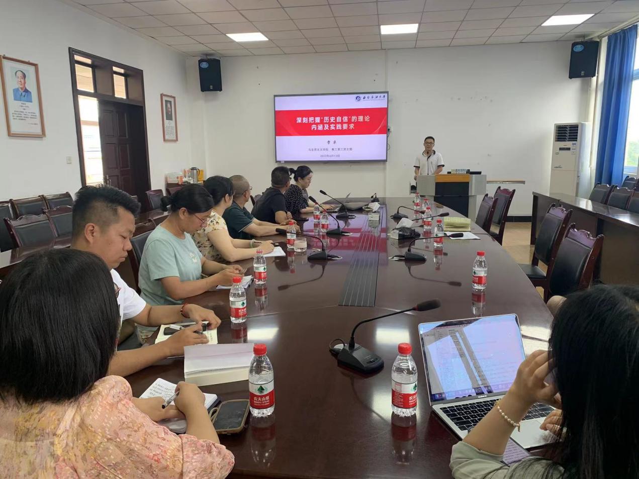 为深入学习贯彻党的二十大精神,团结引领党员教师不忘初心、牢记使命,引领大家不断坚定历史自信,增强历史主动。6月14日下午,教工三支部在思学楼D507开展学习贯彻习近平新时代中国特色社会主义思想主题教育专题党课。支部书记李卓同志以“深刻把握‘历史自信’的理论内涵及实践要求”为题讲授专题党课,支部党员和西昌幼专两名党员教师参与此次党课学习。