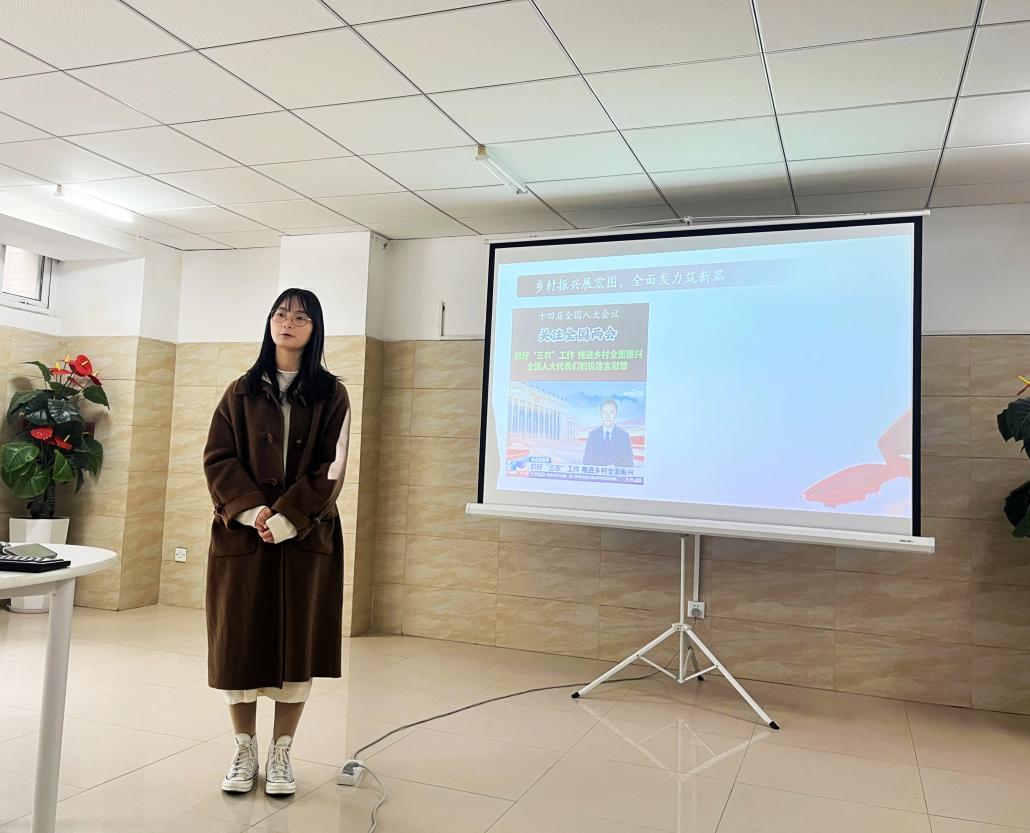 何佳琦聚焦乡村振兴进行交流发言,她的《乡村振兴展宏图,全面发力筑新篇》一文,从理解“全面”二字出发,结合2024年中央一号文件,深刻阐述了学习“万千工程”经验推进乡村全面振兴的重要性和行动举措。围绕这一中心,在场党员踊跃讨论,积极发言,徐娟分享到,“要深化运用‘千万工程’做法经验,有力有效推进乡村全面振兴,把‘路线图’转化为‘施工图’‘实景图’,充分发挥学子力量,实现乡村全面振兴。”