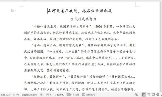 本次征文活动总共历时一周时间,通过对文章的征集和优秀文章的评选,提升了同学们防范疫情的意识,使同学们心灵得到了提升和净化,也使大家学习到了白衣天使身上无私奉献,大爱无疆的精神。本次活动在这个寒冷的冬天丰富了大家的精神世界,更是弘扬了我们中华民族不屈不挠的民族精神和抗疫精神。