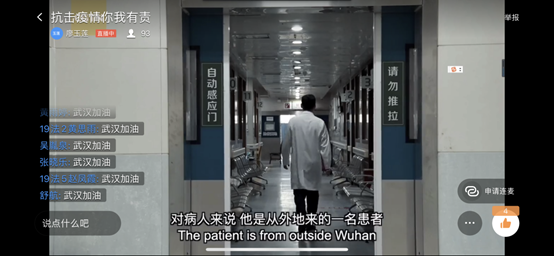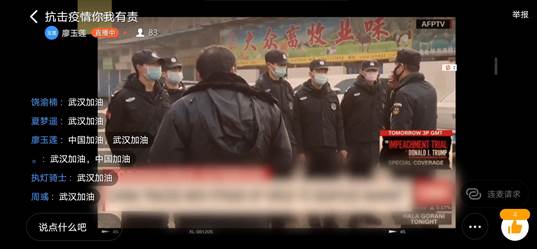 下午三点,主题观影活动正式开始,本次活动采取屏幕共享的方式进行。在看到全国各地的资源争分夺秒地驰援武汉时,线上观影的同学们都被深深地感动了,“中国加油,武汉加油”等留言不断出现在屏幕上。我们相信,爱和希望,总比病毒蔓延得更快;信念和勇气,总能拨开笼罩着的阴云。