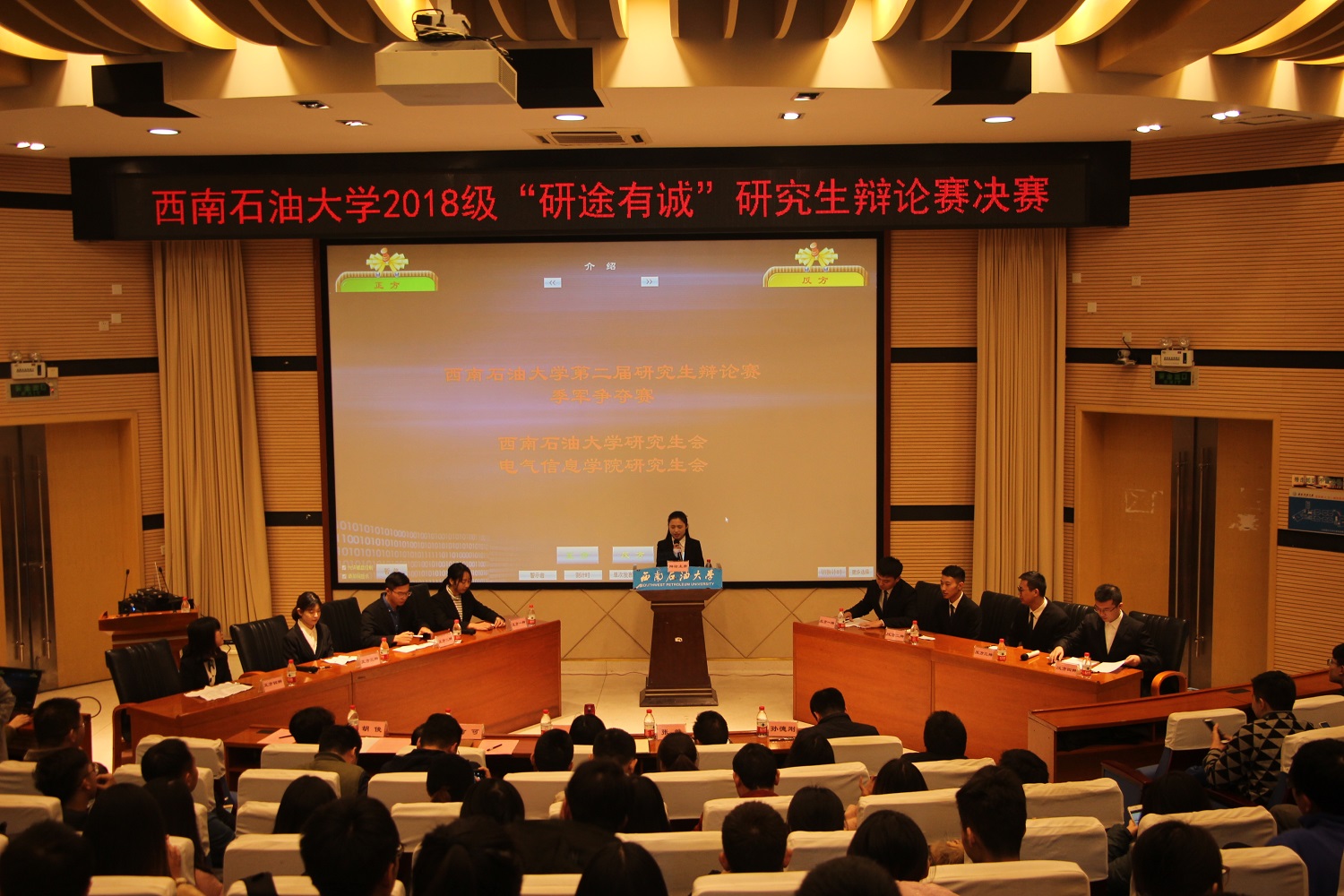 2018年12月19日下午,西南石油大学2018年“研途有诚”研究生辩论赛决赛在思学楼A114举行。石油与天然气工程学院、经济管理学院、马克思主义学院、计算机科学学院四支队伍在决赛圈展开角逐。出席并担任此次比赛的评委嘉宾有:校党委宣传部、统战部副部长牟卿、学生工作部(研究生工作部)副部长方可、校团委副书记张维、电气信息学院党委副书记胡俊、外国语学院党委副书记孙德刚。各学院研究生共200余人观看了此次比赛。