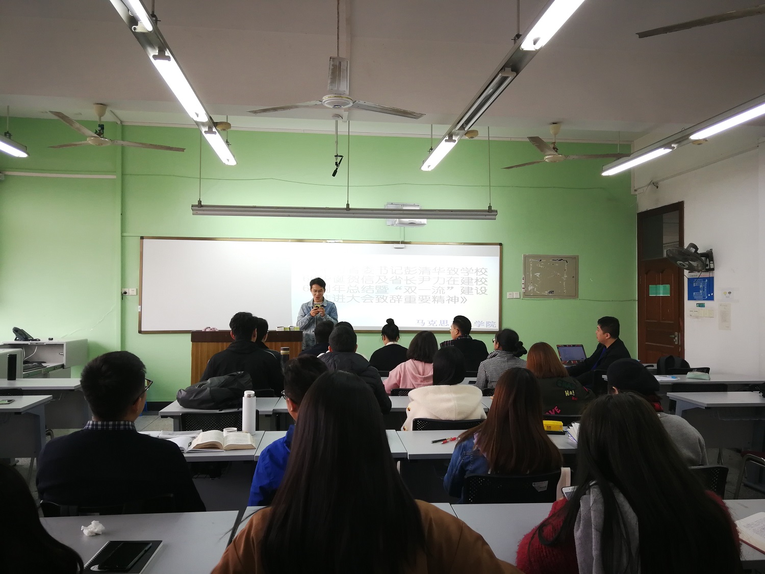11月7日下午4点,马克思主义学院2018级研究生集中学习省委书记彭清华致学校60华诞的贺信及省长尹力在建校60周年总结暨“双一流”建设推进大会上的致辞重要精神。会议由辅导员霍向军主持,马克思主义学院2018级研究生参加。