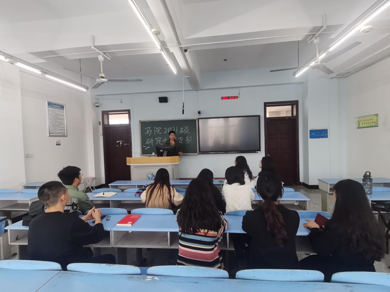 为持续加强党的创新理论武装,不断提高党员干部马克思主义水平,4月13日下午,马克思主义学院研究生2021级党支部在思学楼C503教室召开党支部理论学习会。会议由党支部副书记何佳主持,全体党员参与。