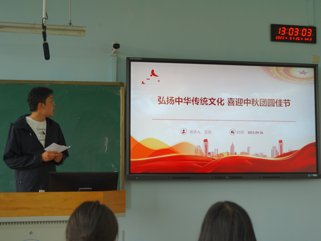 活动伊始,化学化工学院王欣向同学们介绍了弘扬中华优秀传统文化的必要性;随后向同学们介绍了中秋节的由来以及渊源。在此过程中,同学们加深了对于传统节日以及传统文化的认识。随后,马克思主义学院邓心一上台,首先为同学们展示一段关于爱国主义的视频;而后以视频为起点,带领大家深入思考爱国主义精神的意义以及现实价值,并引导同学进行讨论;最后学院宣讲人邀请同学们一起身体力行,践行并发扬爱国主义精神。