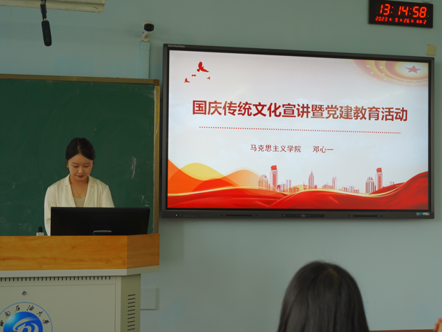 为增强研究生会干事爱国主义意识、弘扬爱国主义精神,西南石油大学马克思主义学院研究生会联合化学化工学院研究生会于9月26日中午在明德楼B303召开了以“弘扬爱国主义精神、学习中华优秀传统文化”为主题的党建活动。