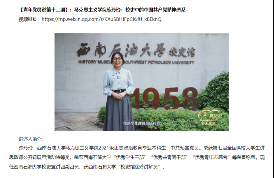 为巩固拓展主题教育成果,引导青年党员深入学习贯彻习近平新时代中国特色社会主义思想,搭建青年党员开放思政课交流平台,学校党委近期特别推出“青年党员说”研学活动。截止目前,已发布16期研学视频,展示了西南石油大学青年党员立足工作或学习实际学习新思想的心得体会,和“使命在肩、奋斗有我”的精神面貌,进一步激励广大青年党员树好“青年志”、点燃“青年梦”、奋斗“青年路”,为建设世界一流学科、一流能源大学和百年名校贡献青春力量。