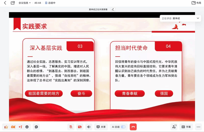 金句分享环节,沈铮怡同学结合高校定位,解读天津大学回信关键语句,提出新时代青年要融个人理想于国家大局、练过硬本领、勇担当作为;刘亚希同学分析中国农业大学回信金句,建议农业高校优化培养体系、构建创新体系、厚植学生三农情怀,两人分享引发共鸣。主持人还提出青年实践要求:坚定理想信念,将个人学业、职业与国家命运结合;练就过硬本领,结合课堂学习与社会实践转化理论成果;深入基层实践,通过志愿服务增强群众感情;担当时代使命,为中国式现代化与民族复兴奉献力量。