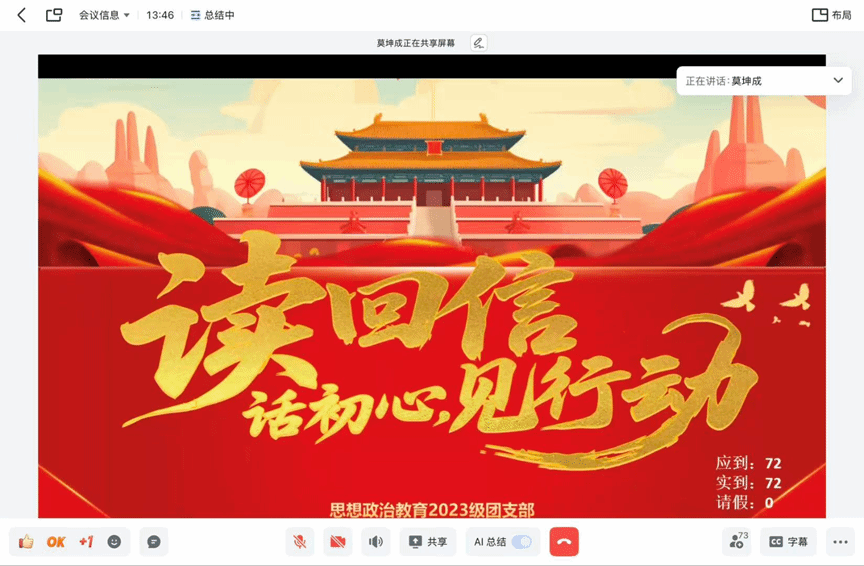 活动最后,主持人表示这是个人首次组织团课,欢迎大家提出改进意见,并播放当代青年模范践行回信精神的视频,为团课画上圆满句号。本次团课让同学们深刻理解回信精神,大家纷纷表示,将以回信精神为指引,在学习生活中坚定理想、锤炼本领、勇于实践,以青春之我为国家发展、民族复兴贡献青春力量。