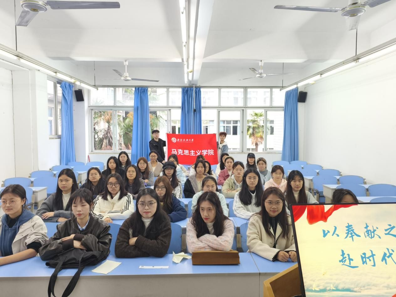 为深入学习贯彻习近平新时代中国特色社会主义思想,引导入党积极分子深刻领会奉献精神的时代内涵,自觉将个人成长融入国家和民族发展大局,11月7日下午,入党积极分子培训班在思学楼A209组织开展了“以奉献为炬,燃亮青春征程”主题实践活动。本次活动由学院团委组织部第二负责人侯彦伶、贺飞雪共同主持,马克思主义学院全体入党积极分子共同参与。