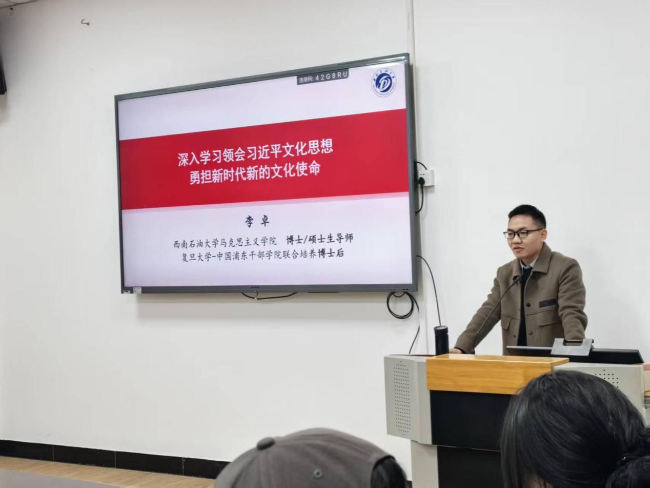 讲解过程中,李卓注重理论联系实际,结合文化领域热点与政策导向,解析习近平文化思想的现实意义。他强调,学习贯彻这一思想,关键在于深化对中华文化的理性认知,牢固树立文化自信,自觉担当起推动文化繁荣、建设文化强国、讲好中华文明故事的时代使命。最后,他鼓励全体学员作为青年马克思主义者,要主动学习宣传党的创新理论,积极践行习近平文化思想,将文化自信融入言行,努力成为传统文化的传承者、先进文化的弘扬者和中国故事的讲述者。