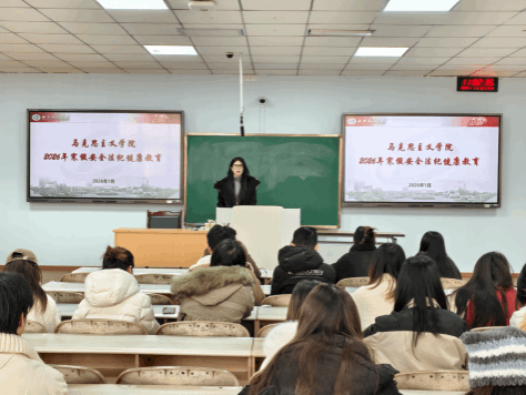 为切实做好寒假期间的学生教育管理工作,强化学生的安全意识、法纪观念与健康防护能力,确保全体同学度过一个平安、健康、充实的假期,2026年1月13日,思想政治教育2023级于思学楼C209教室召开以“筑牢安全防线,共度平安假期”为主题的寒假安全、法纪和健康教育主题班会。班会由2023级兼职辅导员龚倩主持,2023级全体同学参加。