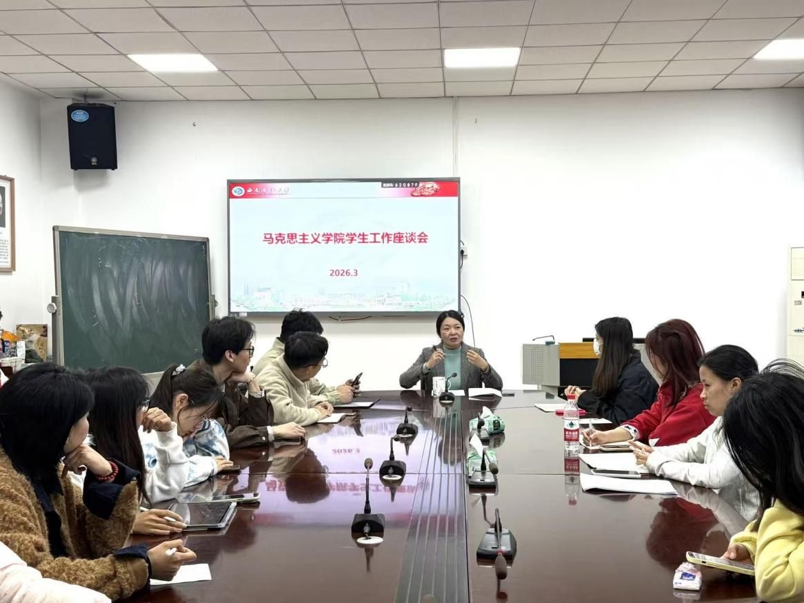 2026年3月23日,马克思主义学院于思学楼D507召开2026年春季学期学生工作座谈会,学院党委书记林莉主持会议并部署新学期学生工作,团委书记、本科生辅导员李锦韬,研究生辅导员罗朝民,各年级班长、团支书参加会议并进行讨论。
