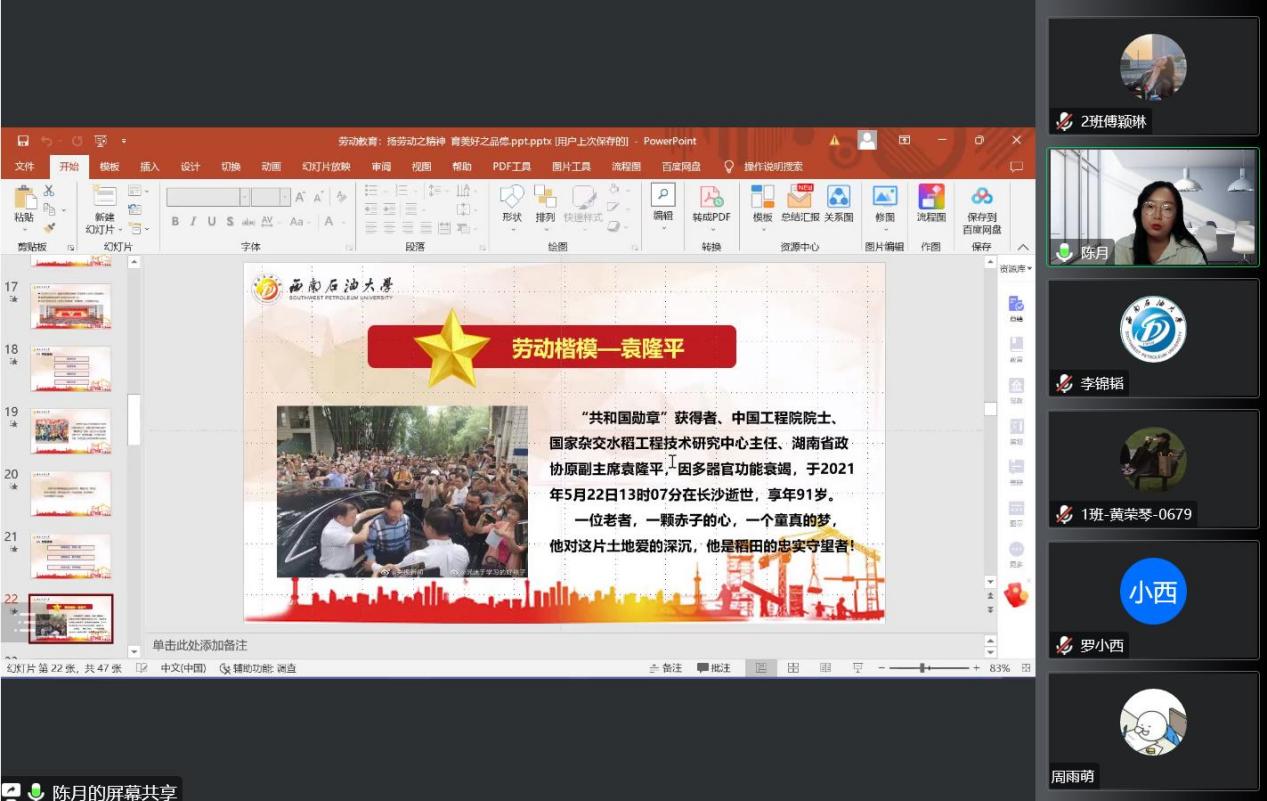 陈月通过劳动楷模—袁隆平的故事指出劳动精神的丰富内涵,其中工匠精神值得我们深入学习。器物有形,匠心无界。作为一个制造大国所推崇的时代精神,工匠精神的指向早已超越了工匠这个单一的群体,折射出各行各业一线劳动者的风貌和价值追求,体现为新时代劳动者的实干创新和爱国奋斗。