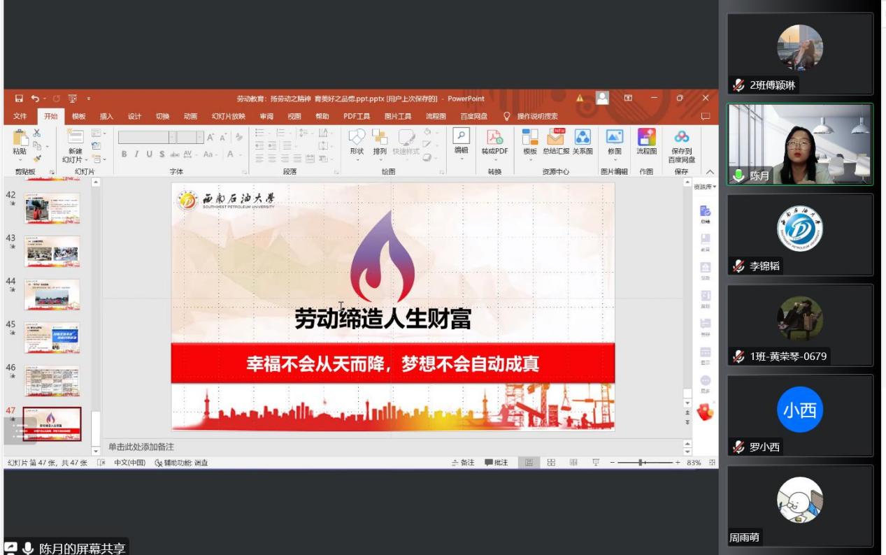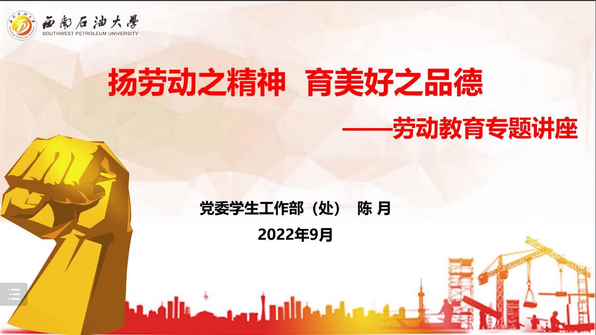 为了使2022级全体新生拥有良好的职业生涯规划,完善就业素质,提升职业道德水平,马克思主义学院于9月22日晚上通过线上方式开展了全体新生劳动教育。党委学生工作部(处)陈月老师受邀为同学们做了题为“扬劳动之精神,育美好之品德”的讲座。本次讲座由辅导员李锦韬主持,2022级全体新生参加。