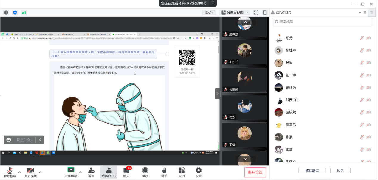 为贯彻落实学校关于疫情防控工作的部署要求,提高同学们的自我防范意识。2022年10月13日下午,马克思主义学院通过腾讯会议开展了学习《防疫中的违法违规行为及法律后果》主题班会。本次会议由辅导员李锦韬主持。