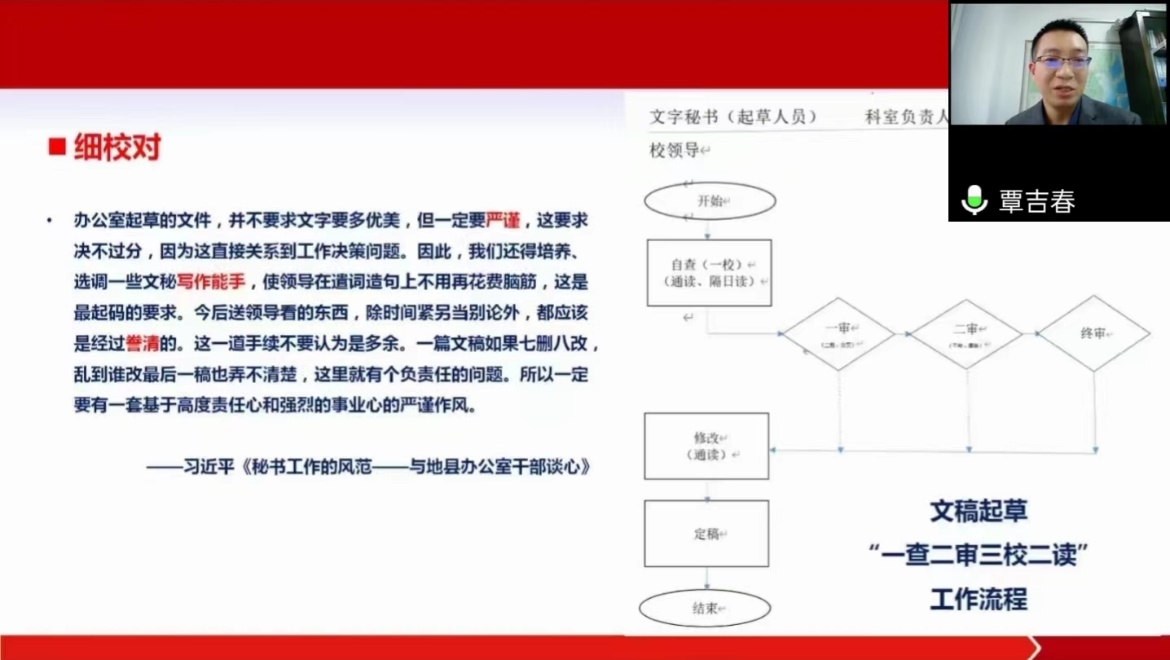 讲座中,覃吉春教授首先强调了公文写作在日常工作中的重要性,随后,覃教授以党的二十大报告为例,从学部署、学标题、学文种、学格局、学谋篇、学内容、学两点、学校对这八个方面,详细讲述了一篇公文从决定起草到定稿校对的过程,及各个过程需要注意的基本事项。