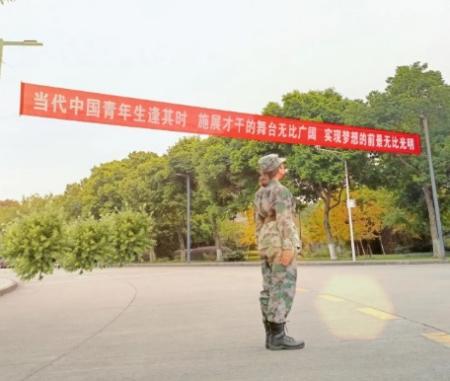 习近平总书记在党的二十大报告中指出:当代中国青年生逢其时,施展才干的舞台无比广阔,实现梦想的前景无比光明。我的作品中身穿迷彩服的女生是学校教导大队的一名队员,她怀揣着对军旅生活的渴望拥抱着一颗赤诚的爱国之心,在这张写满了总书记寄语的横幅下,她在回望,在仰望在信仰着这份精神。