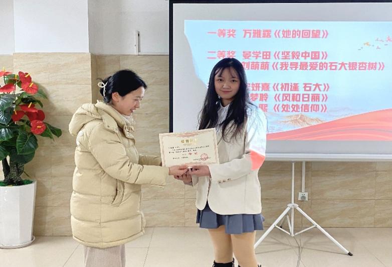 颁奖仪式由三部分组成,首先由活动负责人为获奖同学颁发获奖证书,并向获奖同学表达祝贺,希望她们能继续坚持对摄影的爱好,对发现美的追求;然后获奖同学发表了获奖感言,展示了摄影技巧,并对工作人员表示了感谢;最后所有人员进行合影留念。