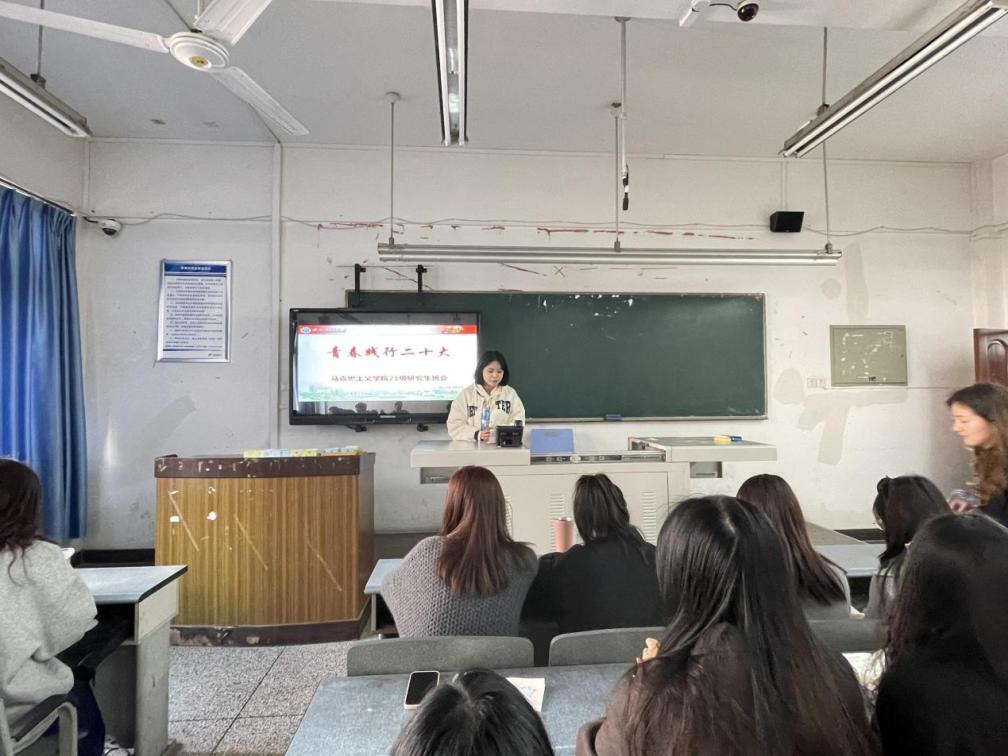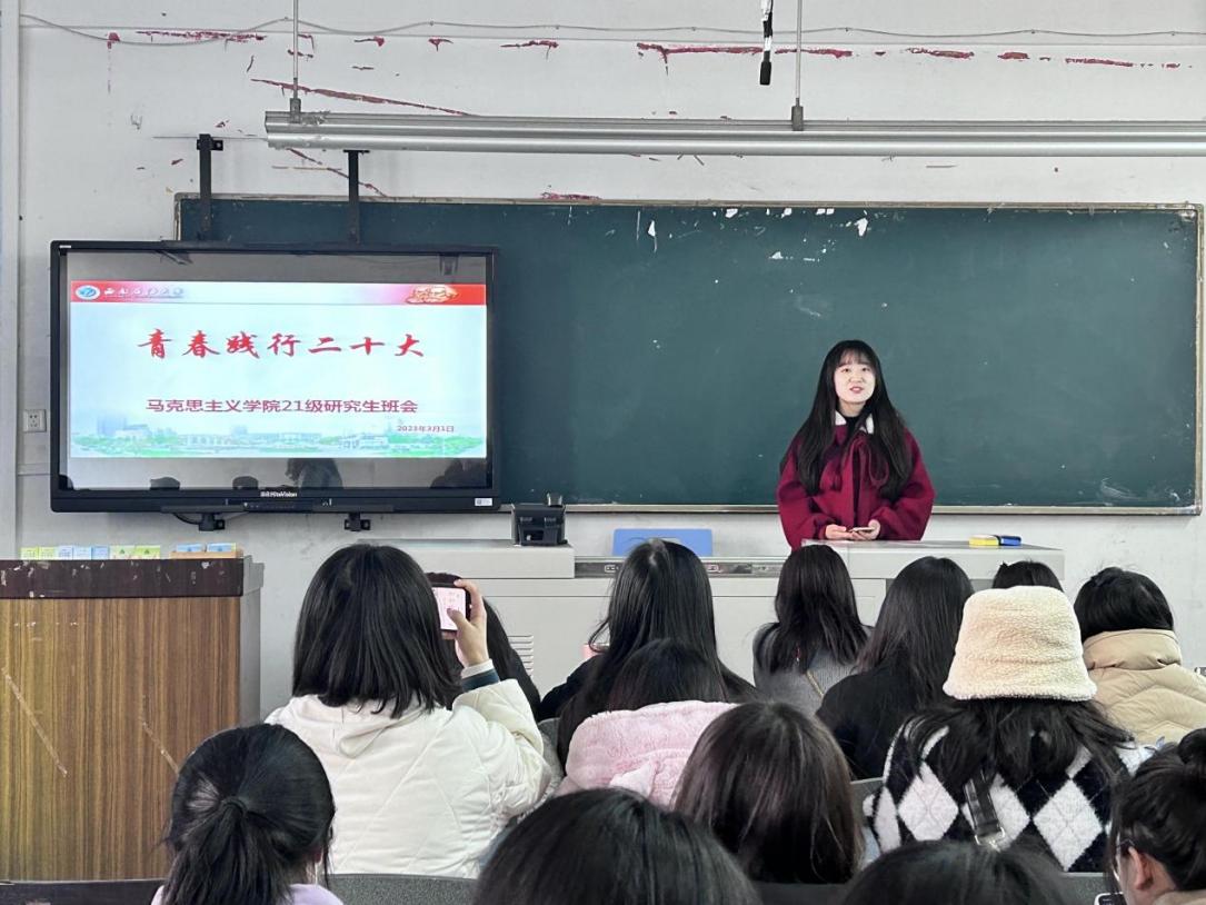 为深入学习贯彻党的二十大精神以及习近平新时代中国特色社会主义思想,增强“四个意识”、坚定“四个自信”、做到“两个维护”,扎实有效的推进同学们的思想工作,推动同学们树立顽强拼搏的精神。于2023年3月1日下午,马克思主义学院2021级全体研究生召开了主题为“青春践行二十大”主题班会。会议由班长黄茜雅主持,辅导员罗朝民老师到会指导。